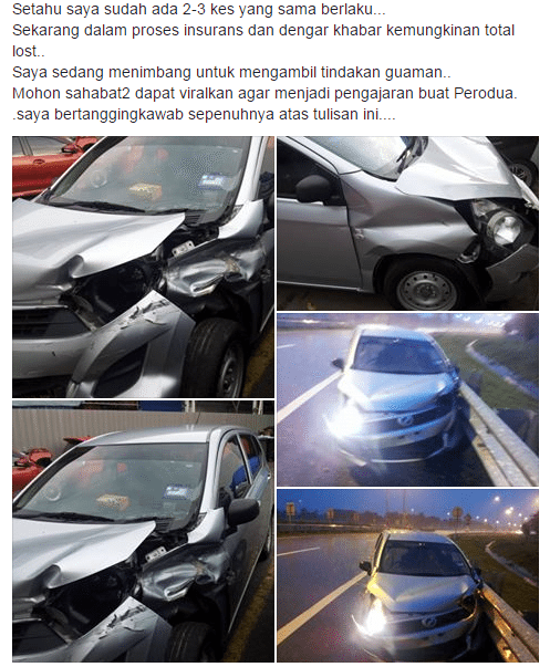 Saya baru beli Axia. Baru-baru ini seorang pengguna Perodua Axia telah menulis di akaun Facebook miliknya mengenai masalah pada keretanya yang telah menyebabkan kemalangan. Jika dibiarkan saja masalah-masalah kecil boleh melarat dan menyebabkan anda perlu keluarkan belanja lebih untuk kos pembaikan nanti.