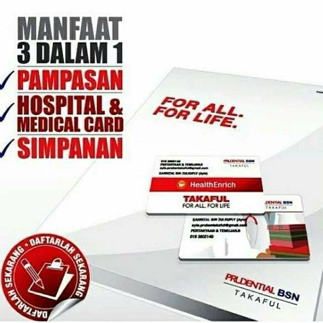 Prudential Bsn Takaful ada tak pakej Kad Perubatan yang hanya perlu satu kad perubatan. PENYAKIT KRITIKAL TERMINAL ILLNESS PENGGANTIAN PENDAPATAN PAKEJ KELUARGA KAD PERUBATAN ELAUN WAD KEMALANGAN DIRI SIMPANAN PERSARAAN. Jika berlaku kematiansemua harta akaun simati termasuk simpananasbepf akan dibekukan sementara bagi memalui proses wasiat atau faraidHibah Takaful pampasan takaful antara instrumen yang terbaik untuk penama mendapat wang dengan segera untuk meneruskan hidup sementara akaun yang dibekukan dapat dicairkan semula.